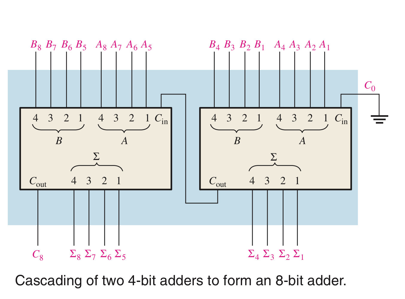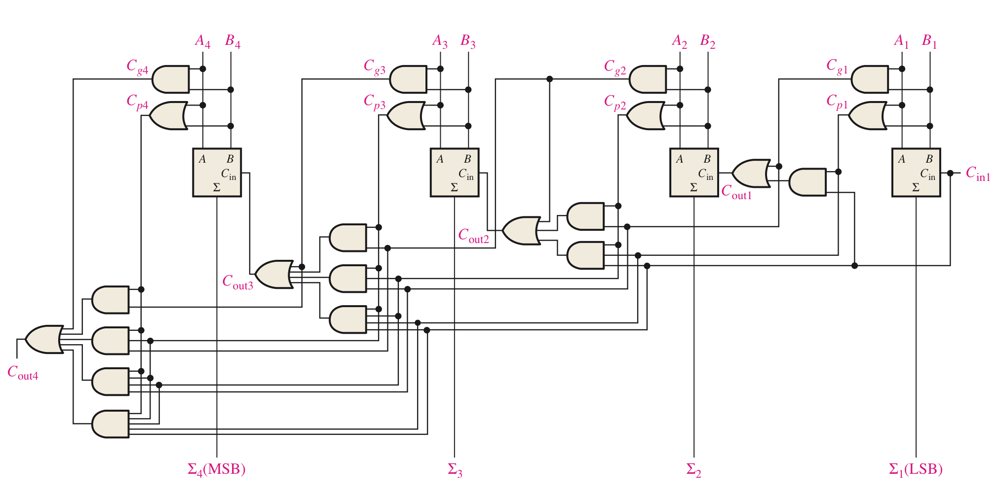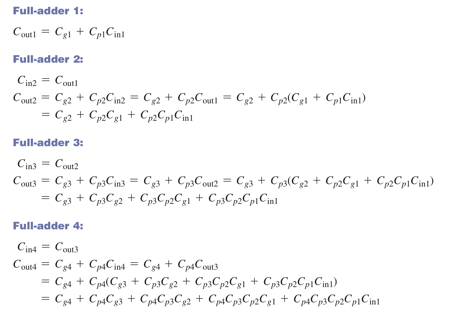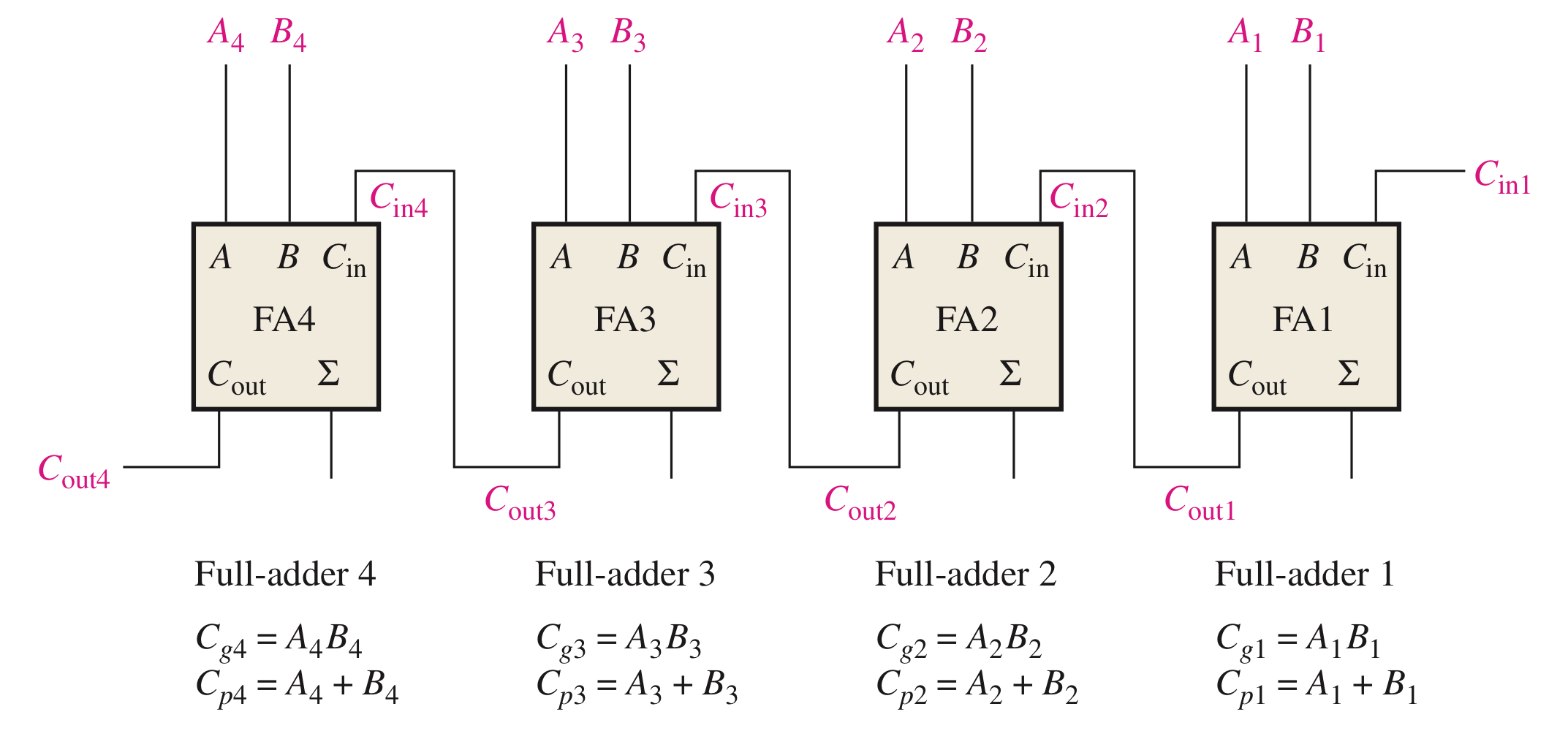 각 단의 $C_{g}$와 $C_{p}$ 함수는 전가산기 입력 비트 A와B로 나타낼 수 있으며 모든 출력 캐리는
