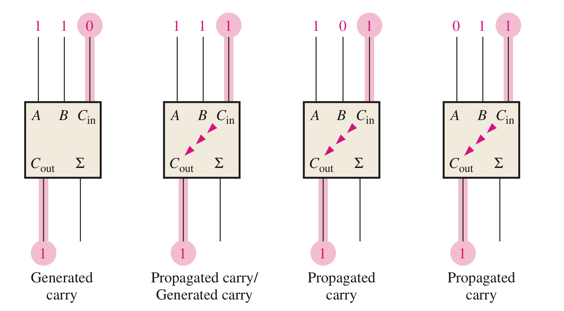 캐리 발생은 출력 캐리가 전가산기에서 내부적으로 발생할 때 일어난다. 즉, 두 입력 비트가