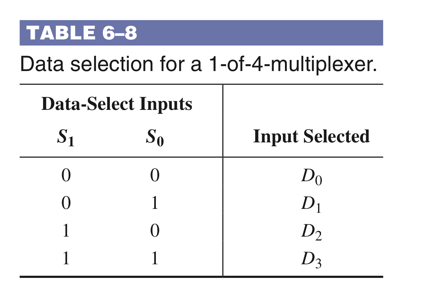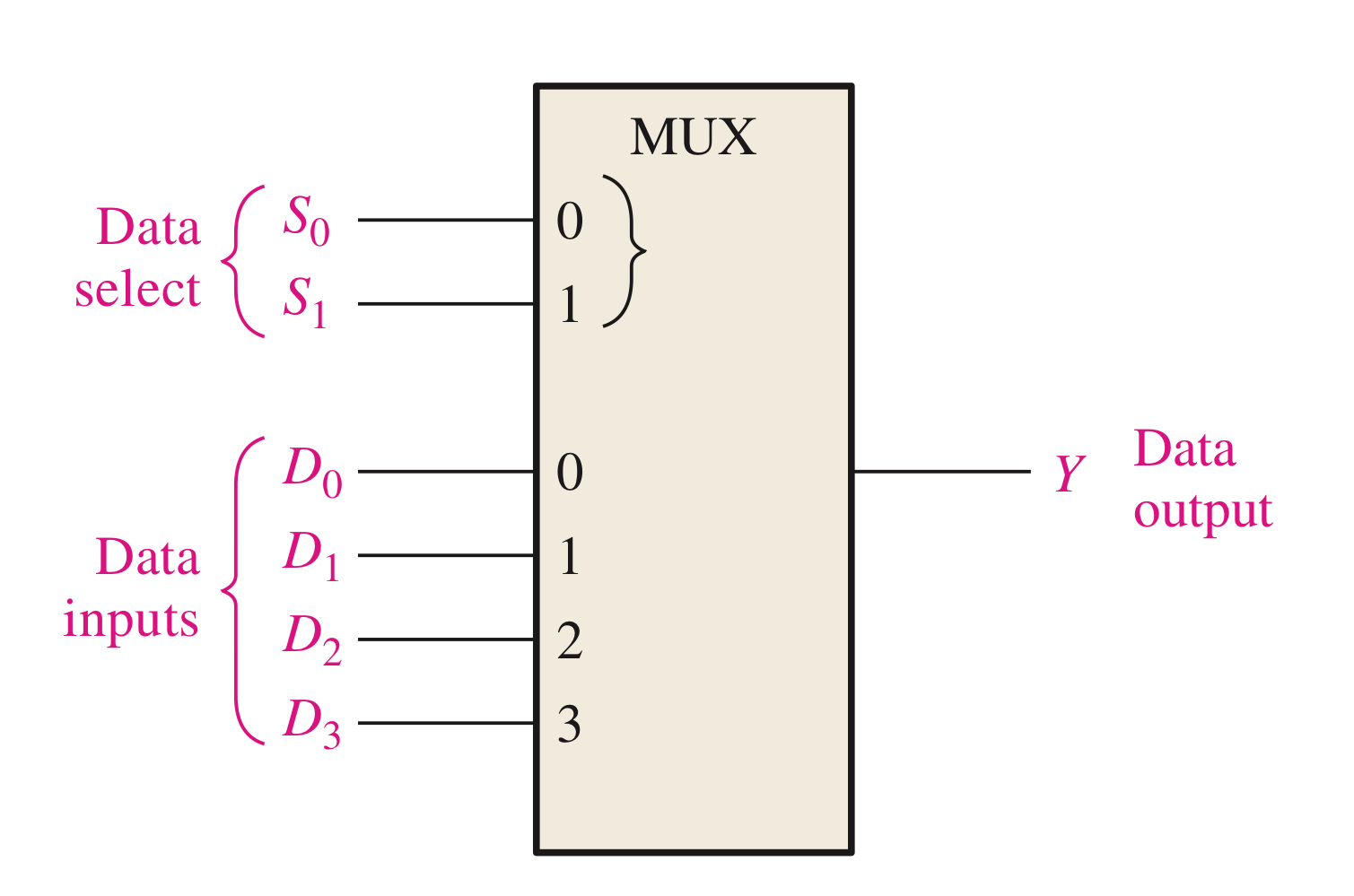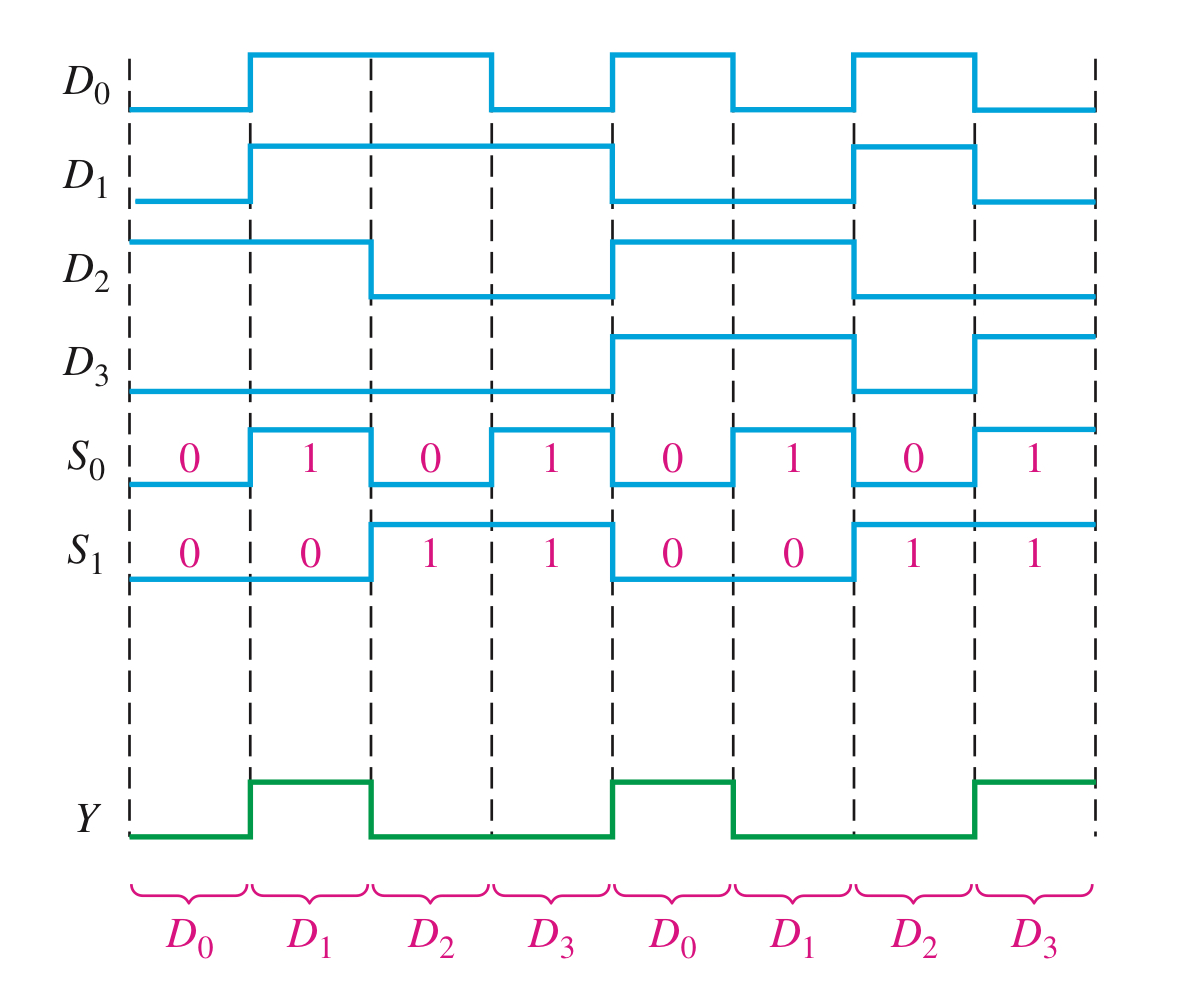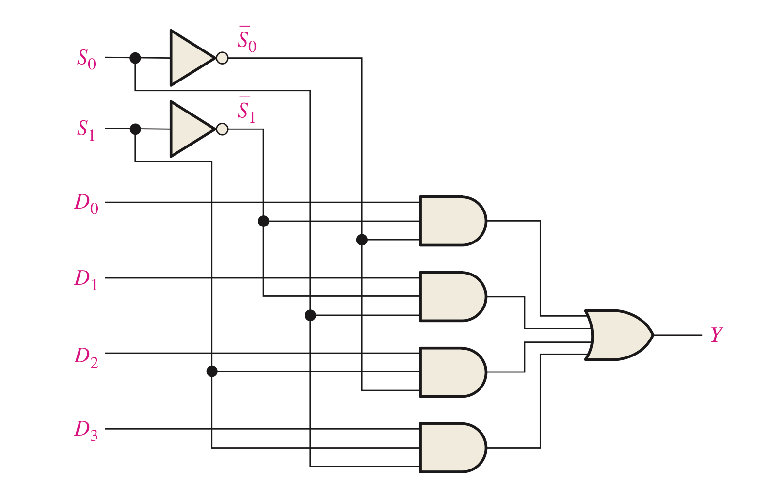 $$ Y = D_{0}\overline{S_{1}}\overline{S_{0}}+D_{1}\overline{S_{1}}S_{0}+D_{2}S_{1}\overline{S_{0}}+D_{3}S_{1}S_{0}$$