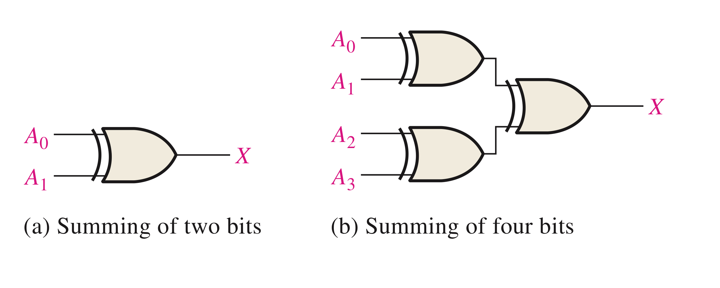 Exclusive-OR 게이트를 이용해서 2비트와 4비트에 대한 모듈로-2에 대한 합에 대한 회로는 아래와 같습니다.