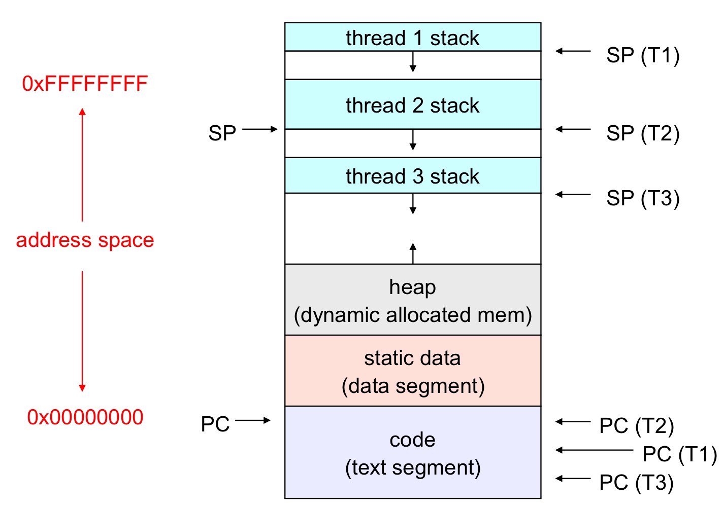 왼쪽이 address space인데, 프로세스는 Stack이 구분되어 있지 않고 하나의 Stack입니다.