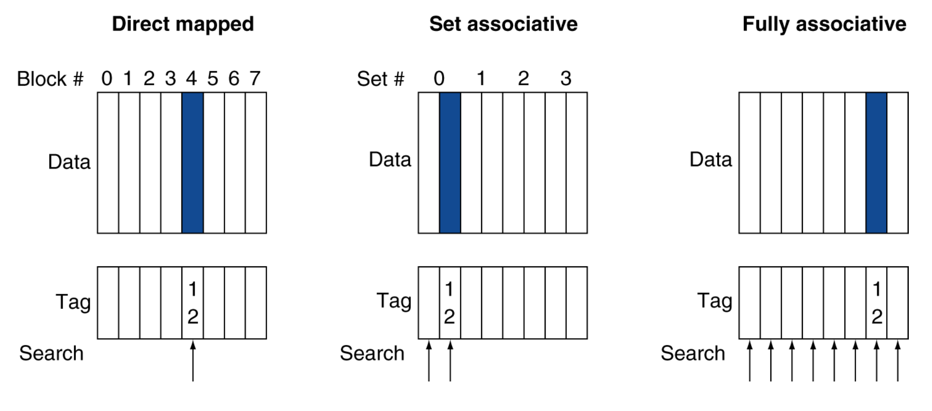 | Tag / Block index / Block offset / Hit or Miss / Replace | Tag / Block index / Block offset / Hit or Miss / Replace | Tag / Block index / Block offset / Hit or Miss / Replace | ||||||||||||||