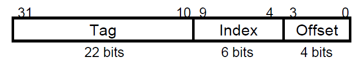 1. $\text{Block index =} \; \frac{Cache size}{word * Block} \; = \; \frac{64Byte}{16Byte} \; = \; \text{4 Blocks} \; = \; 2^{2}\; = \; \text{2 bit}$