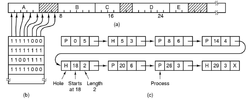 (b)는 Bit map을 말하는 것으로 1로 표시된 것은 프로그램이 적재되어 있는 곳을 표시하고, 0은 빈 공간을 표시하는 것 입니다.