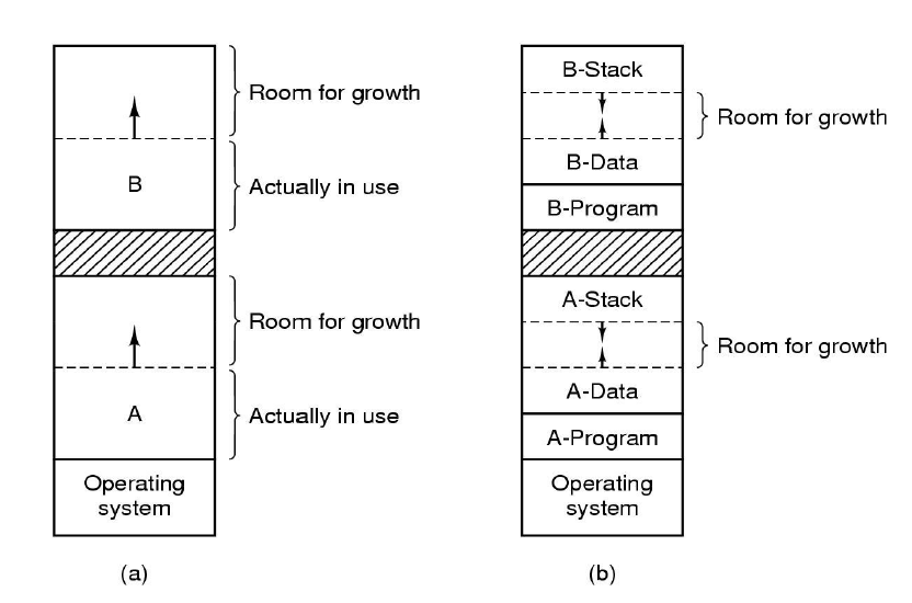 (a)를 Program A, (b)를 Program B라고 했을 때, 두 프로그램은 (c)와 같이 프로그램이 메모리에 적재하게 됩니다.
