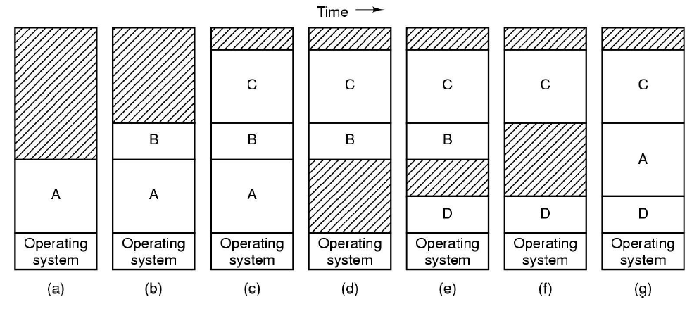 예를 들어서, compaction은 (e)에서 C와 B를 앞으로 당겨서 A가 들어갈 공간을 만들어주는 것 입니다.