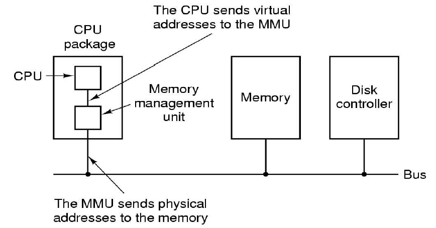 위의 그림에서 Paging과 연관된 것 뿐만 아니라 MMU에는 Base and Limit register방식이 사용되거나 Paging 기법이 Hardware기법이 들어갈 수 있습니다. MMU에서는 Virtual address를 변환시켜서 Physical address를 memory bus에 올리게 됩니다.