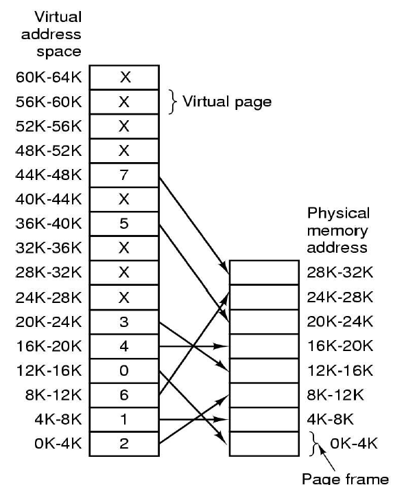 위의 그림은 Paging에 대한 것으로 각 virtual page는 4K단위로 나뉘어져 있는 것 입니다. 64K이므로 총 15개의 page를 가집니다.