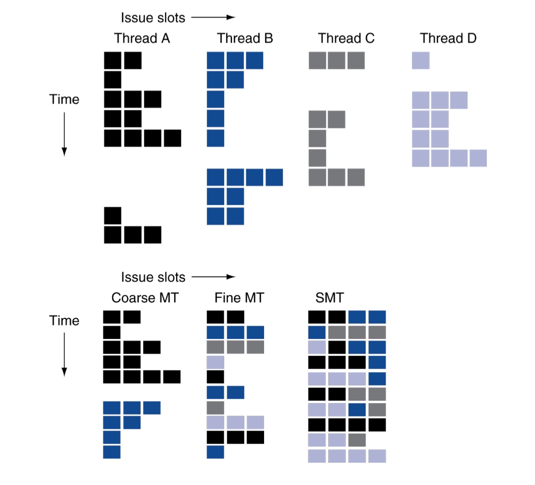 multithreading의 예시에는 coarse multithreading과 fine multithreading 그리고 simultanuous multithreading이 있습니다.
