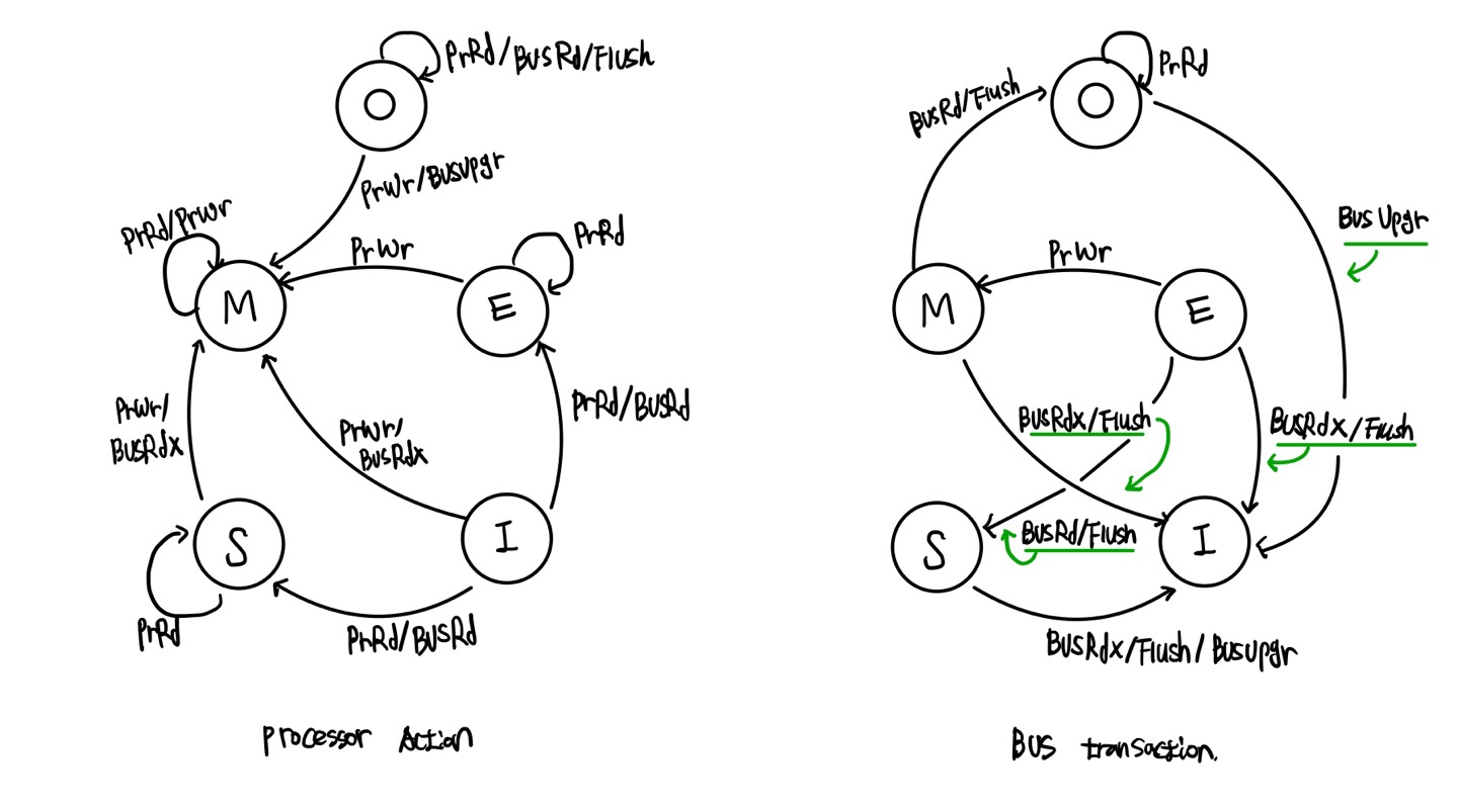 · MESI protocol과 달리 Shared 상태의 캐시 라인이 메모리와 비교해 dirty일 수 있습니다. 이 경우에는 다른 캐시 중 하나가