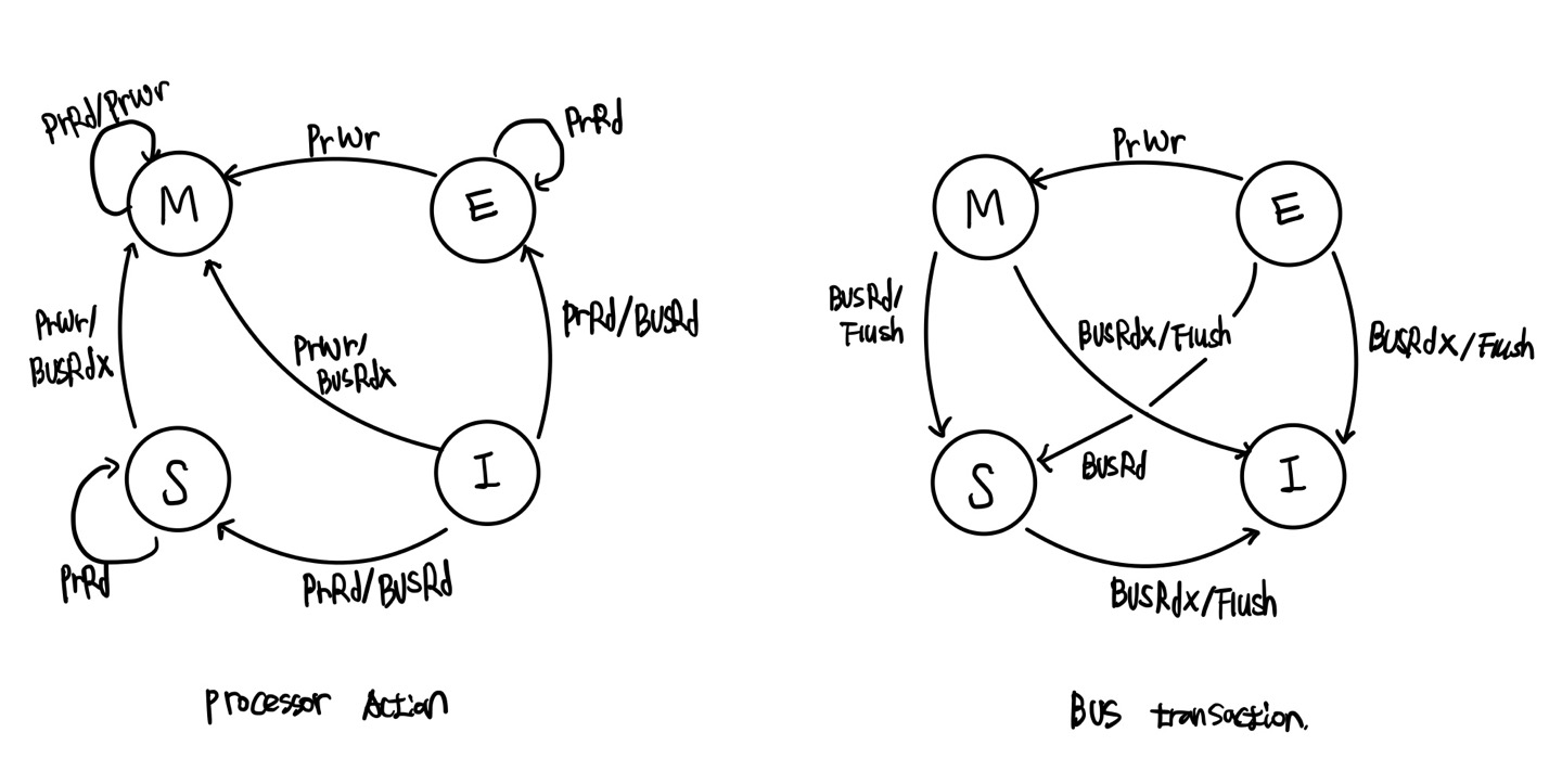 지금까지 cache coherence에 대해서 살펴봤습니다. state diagram과 함께 설명들을 쫓아가보시면 이해가 훨씬 쉽습니다.