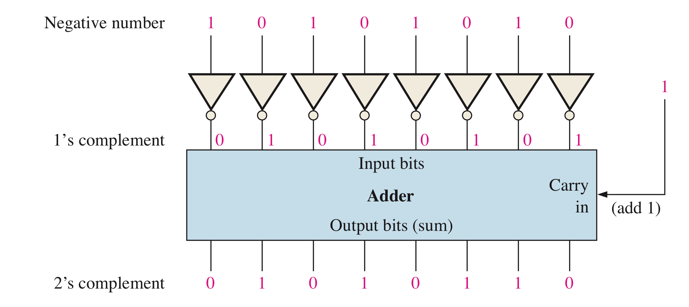 위는 음수의 2진수를 인버터와 덧셈기를 사용하여 구하는 방법에 대한 예시입니다.