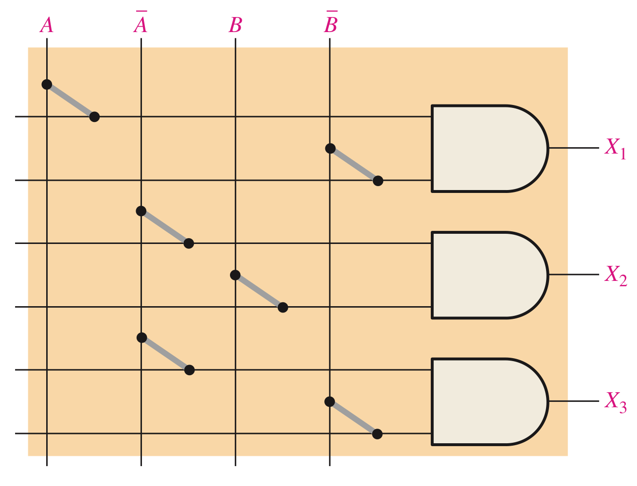 AND Array는 AND 게이트와 각 교차점에서 프로그래밍 가능한 링크가 있는 상호 연결 행렬로 구성됩니다.