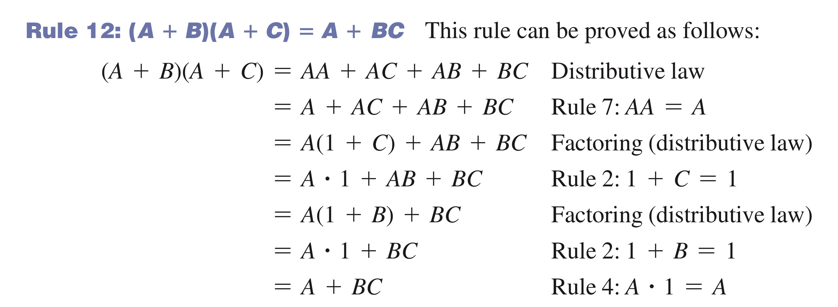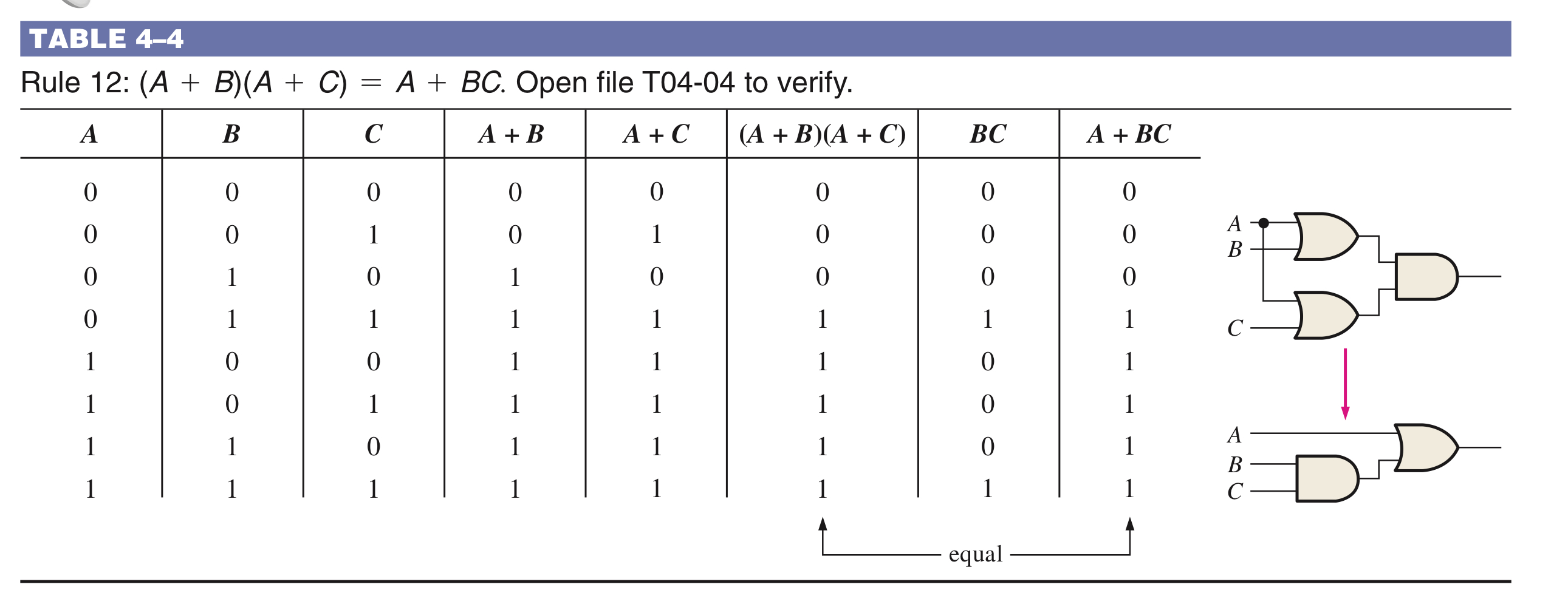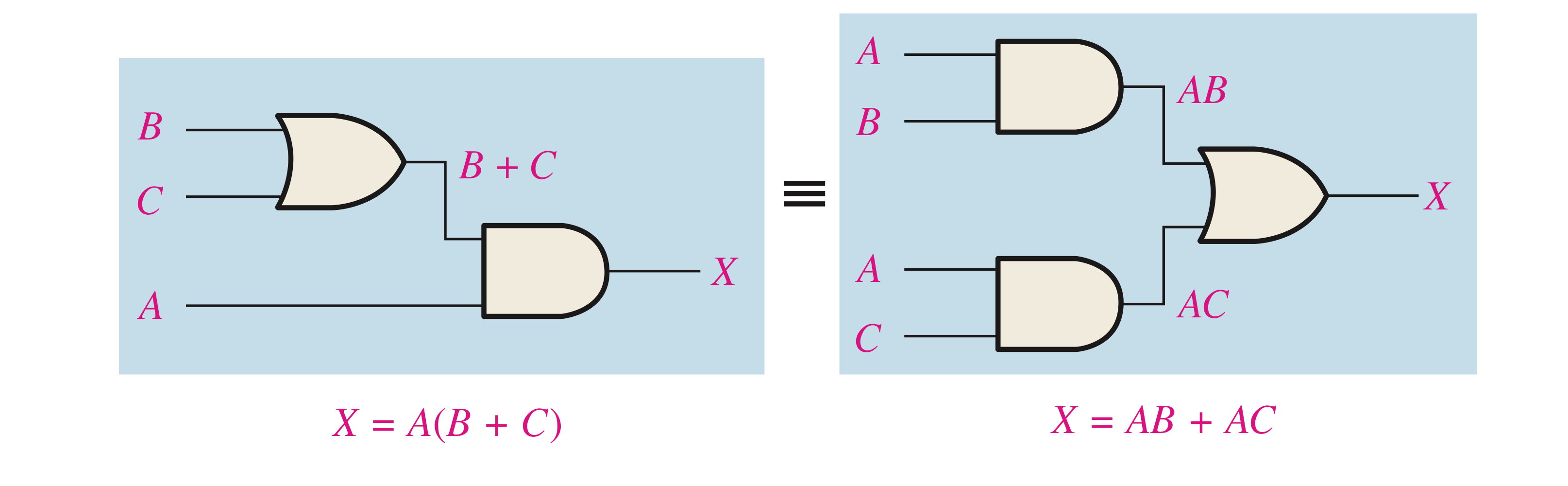 $$ x(y + z) = xy + xz $$ | $$ x + yz = (x + y)(x + z) $$ |
