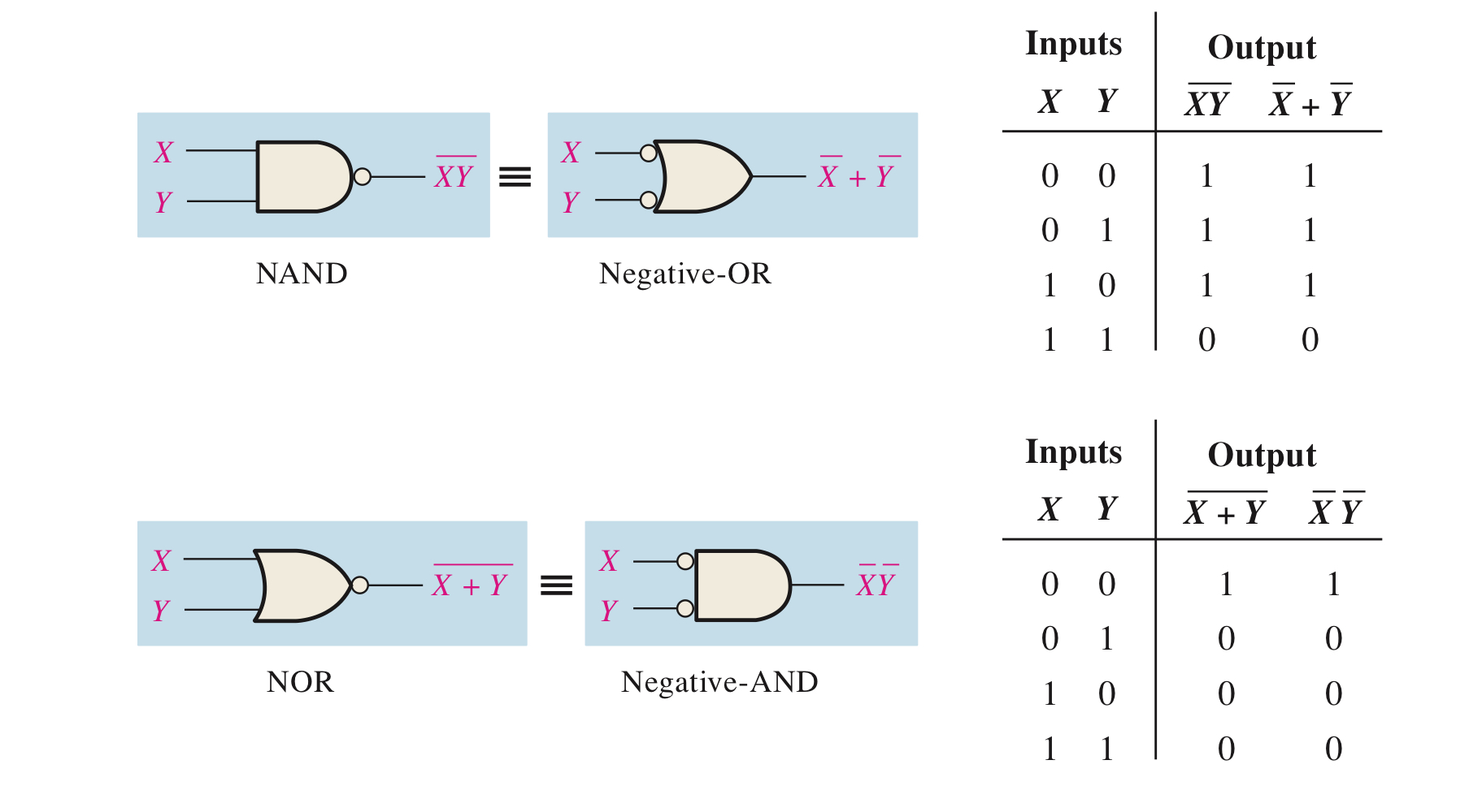 두 가지의 규칙을 NAND와 negative-OR 그리고 NOR과 negative-AND gate로 표현할 수 있습니다.