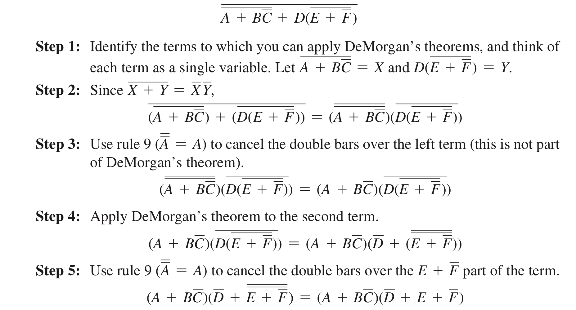 $$ \overline{(x + y)} = \overline{x} \overline{y} $$ | $$ \overline{{xy}} = \overline{x} + \overline{y} $$ |