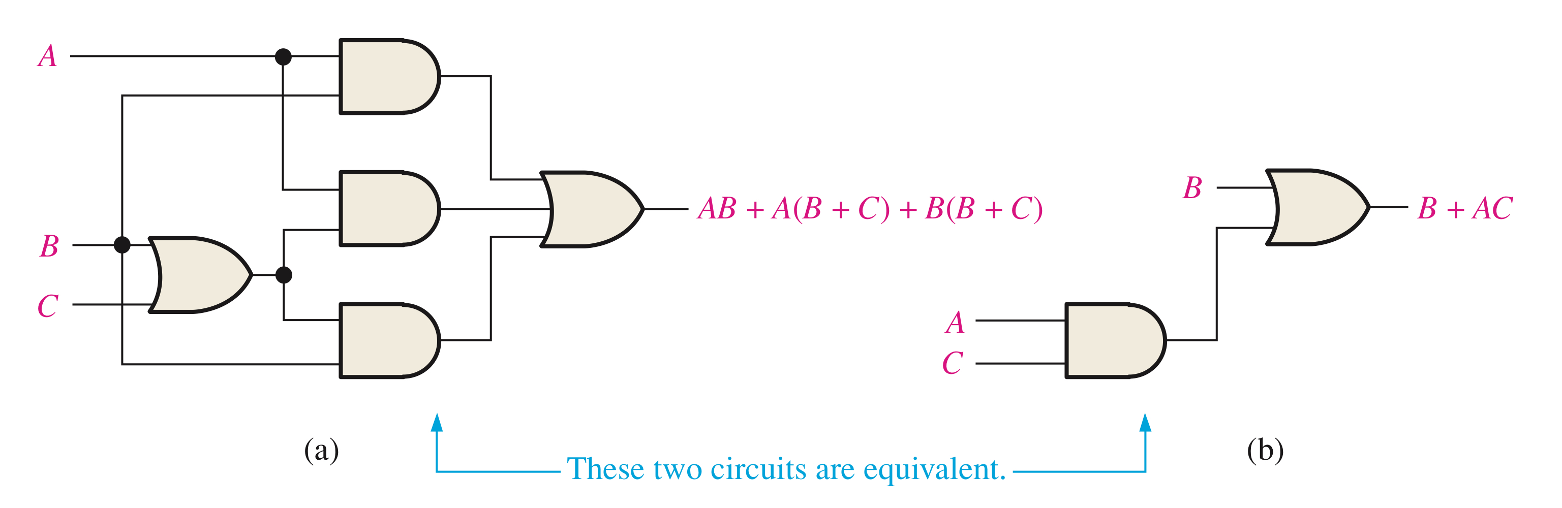 위의 부울대수의 법칙들을 보면, 이를 이용해서 회로를 간단하게 만들 수 있다는 생각이 드시나요?